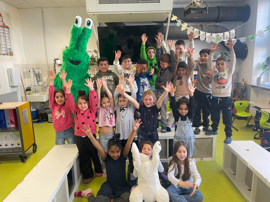 Heute (04.03.2026) bekam die Klasse 1a Besuch von unserem Schulmaskottchen FLiMs. Die Kinder machten große Augen, als unser freundliches Monster durch die Klassentür trat. Nach vielen Umarmungen und Begrüßungen durften die Kinder FLiMs Fragen stellen und lernten, wie Ihnen FLiMs beim Beruhigen helfen kann. Ganz wichtig war den Kindern auch, das FLiMs das Klassentier Lars den Eisbär kennenlernt. Nach einer aufregenden Stunde und vielen Fragen der Kinder, hat sich FLiMs schließlich wieder verabschiedet.