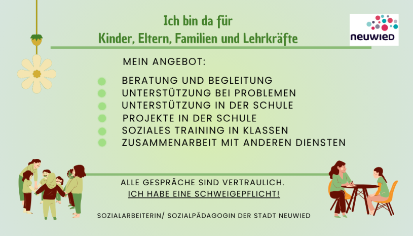 Meine Aufgabe ist es, die Kinder während ihrer Schulzeit bestmöglich zu begleiten, wenn sie Hilfe benötigen, die über das Schulische hinaus gehen. BNei besonderem Hilfebedarf, kann ich an geeigneter Stelle vermitteln. Die Gespräche können in meinem Büro, aber auch bei Ihnen zuhause stattfinden. Ich habe eine Schweigepflicht, auch gegenüber der Schule, daher sind die Gespräche vertraulich.